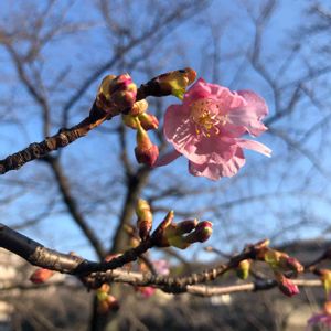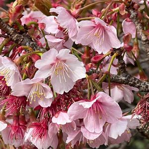 🌸 あたみ桜 🌸 カンヒザクラとヤマザクラとの自然雑種 一枝に早期に開花する花芽(今は花弁が 散って蕊だけが残り)と こちらの様に後期に咲く花芽が 形成されるため 開花期間が1月から2月迄の 1ヶ以上と長いのが、特徴で〜す🌸 沖縄のカンヒザクラと ほとんど同時期に咲き始めるんです🤔