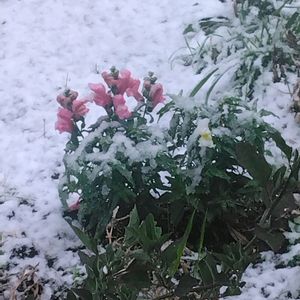 2024.02.05 はつゆき にわの《キンギョソウ》 ピンク・レモン 初雪。 庭の《キンギョソウ》 ピンク・レモン