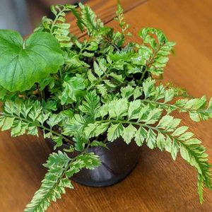 こんばんは😊 今日は、シダの日ですね。 コロナのせいで…ずっとお会い出来なかった 山野草の師匠に 会いに行って来ました🪴 で…この子を頂いてきました。 ただのイヌワラビでは無いです。 斑入りで獅子葉🌿🌿🌿💕 大きくなったら めっちゃ凄い事になるそうです🤣🤣🤣 (同居してる丸い葉っぱはホタルブクロくんです😁)