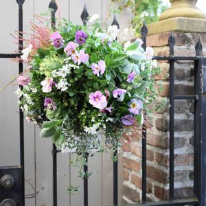 パンジー とイベリスのハンギングバスケット イベリスは耐寒性もあり、長く咲いてくれる最強の脇役です。