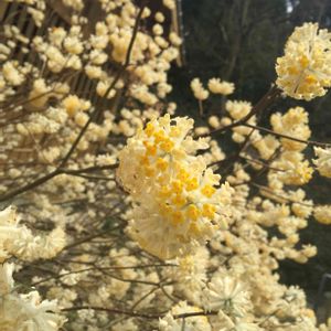 ちょっと前になりますが3月末、木全体の大きさはだいたい2m四方でした。花が中心から外側いっぱいにブワーっと沢山咲いていました。なんちゅう説明…(笑) 名前を教えていただきました。中国原産の沈丁花科のミツマタさん、名前の由来は「枝が三又だから」。もうちょっと可憐な名前をつけたげて…と思いました。 追記: 6月中旬に別の場所でたまたま公園に木の前に立札があってミツマタとありましたが似ても似つかぬ姿、緑の葉っぱに覆われていました。立札がないと気付かなかった…