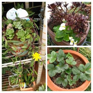 小雨💧ポツポツの中 ⬅️ ちょこっと挿したルビネさんの❁咲きました💖 ↗️ 黒法師の鉢に💧 勝手に生えて…そのまんま🤭 ↘️ 家の🍓ランナーから取った🍓の苗🌱 やっと💦何本か根付きました💖 ✄今朝はレオ様🌹のツル剪定し ボーボーの小枝を整えました💦