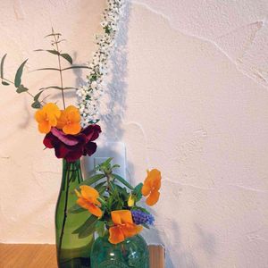 寄植えで育ちすぎたビオラを剪定。 ついでに子どもたちを誘い花を生けてもらうことに。 それぞれのリクエストは… 長女はユキヤナギ 次女はムスカリ。 リーフも入れて完成😊❤️ わが家の植育。