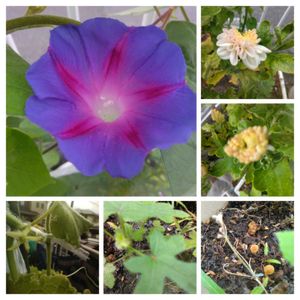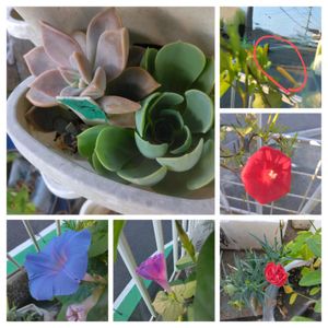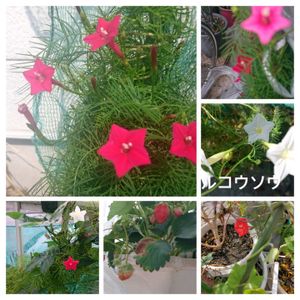 pick No 2051 お早うございます☀ 🥵 今朝の目覚め6:30辺り 昨夕蕾を確認していた朝顔を見るため外に出て 花パト 左上 狭くなった多肉植物 右上 キバナルコウソウ💛 右 サカタのタネさんからの品種 るこう朝顔❤ 下 朝顔 昨年の品種💜 左下 琉球朝顔💙