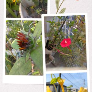 🏷コラージュして遊ぼ♡に初参加させて、頂きました🤗 pick No 2055 8/24 お早うございます☀🥵昨日夕方より孫ベビーとバイバイ👋して帰宅 夜はぐっすり朝まで眠れ今朝の目覚めは6:30昨夕水やりをバタフライピーにやり、花パト 琉球朝顔が蕾があるのを確認、今朝撮影 1⃣毎度おなじみルコウソウ赤色❤ 黄色の花🟡 赤色向日葵❤ ルドベキアタカオの黄色の花🟡 2⃣琉球朝顔💙 昨年からの朝顔💜 デュランタ宝塚💜💙 見に来て頂きコメントや、いいねをありがとうございます。今日も暑い時間帯は室内でテレビ番組見て過ごします。 ٩(๑❛ᴗ❛๑)۶ 皇帝向日葵小さな葉が下から出てきたので良かったでも、先端の頭は枯れたまま、花芽出来るのかしら🧐🤔