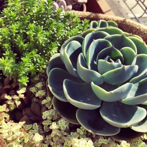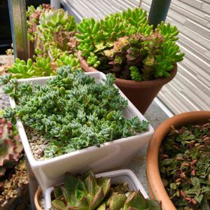 普及種ばかり寄せ٩(๑>∀<๑)۶ このまま壁に掛けられる❤ こんな寄せ植えも嫌いじゃない(*˙˘˙)♡ グリネとセダムがもっとモリモリになったら可愛いと思う😆⤴