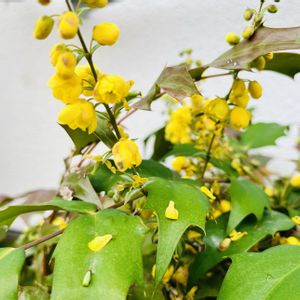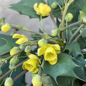 🌱ヒイラギナンテン 鉢植えの柊南天が北側のベランダで咲いています。