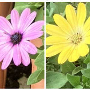 08月05日(火)晴れ☀️ おはようございますo(^_-)O🌅 お隣さんの花壇の鉢植え🪴 ピンクとイエローの花が咲いて いたので、そーっと今流行りの 盗撮してしまいました。イケマセン 🌸🌸オステオスペルマム🌼🌼 兄妹みたいに並んで咲いている