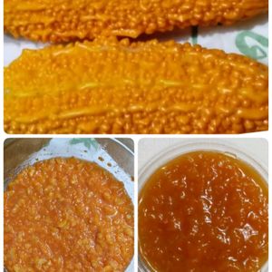 完熟ゴーヤー ジャムを作りました‼️😊 完熟になるのが毎年 待ち遠しいです😃 苦みがマイルドな 我が家のゴーヤーです‼️ 来年用の種も 完熟ゴーヤーから 採取しました‼️