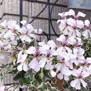 アイビーゼラニウム エレガンテ たくさん咲いてきました´ ³`°) ♬︎*.:* 斑入りの葉っぱは 少し肉厚です。 アイビーに似ている事から アイビーゼラニウムだそうです。 斑は ピンクから白になります♡ 垂れ下がり系で バスケットタイプの鉢に 寄せ植えで 使ってましたが 冬から春の寄せ植えだったので 今はおひとり様です。 のびのびしてますよ(´∀`*)ウフフ♪ 斑入りの葉っぱを覆うように咲くお花… 淡いピンク色がかわいいな(❁´ ︶ `❁)*✲゚*