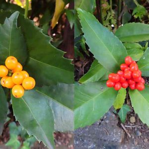 赤い「センリョウ」と黄色い「センリョウ」に出会えました。 パチリ 樹高は50~80cmほど 縁にギザギザのある濃い葉っぱが1年中茂っています。