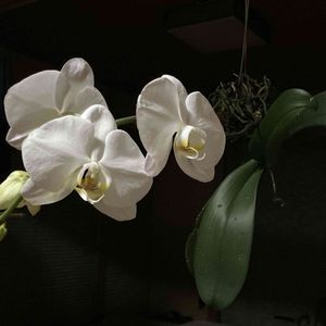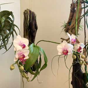 流木付けコチョウラン咲き始めました🤗 暖かい時期は庭木にぶら下げているので葉は毛虫にかじられてます。
