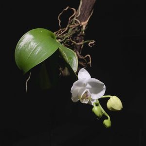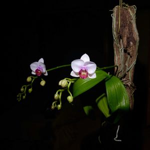 流木に付けたコチョウラン2が咲きました。夏に葉がイモムシにかじられました。