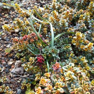 地植えにしてから元気に成長してるレモンタイム 紅葉するんだね( ⸝⸝⸝˙ ˙⸝⸝⸝ ) ひょろっと伸びた葉っぱは去年植えたムスカリ