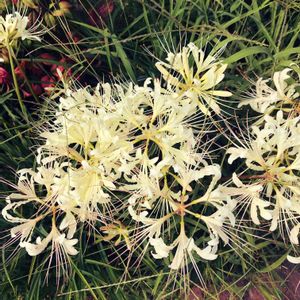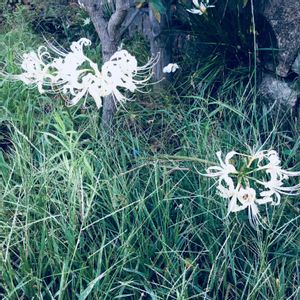 憩いの森にも、シロバナマンジュシャゲが咲いていました * おー✨ 近くにもあったのね、とばかり近付いてみると、ちょっと発見しちゃいました💕 * 白花が赤と黄色からの交配?!というのがどうにもしっくり来なかったのですが… * このお花には、赤い筋が見えるではありませんか❣ * なるほどなーって思ってしまいましたです、ハイ笑 * 奥に一般的な赤い花も、1輪だけ咲いていました * 辺りは白花だらけでした * 2018.9.20 撮影