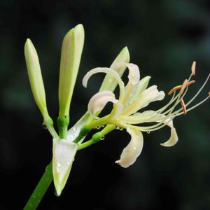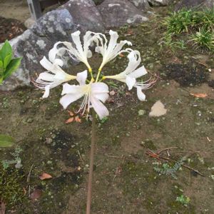 【シロバナマンジュシャゲ】 白花曼珠沙華 ヒガンバナ科 ヒガンバナ属 台風前の雨に打たれ何となく悲しげな白花曼珠沙華 👀 黄色のショウキズイセン(鍾馗水仙)と赤花の彼岸花の自然交配種らしいですが種間交配でその品種は多いようです。 中央にピンクが出るものや写真のように黄色味を帯びるものなど微妙な色合いの違いが楽しめるようです。園芸的には赤花も含めリコリスで球根が出回ってます。 花と葉が同時に出ない為、色々な解説で使われてる『葉は花を思い花は葉を思う』この言い回しが好きです😀