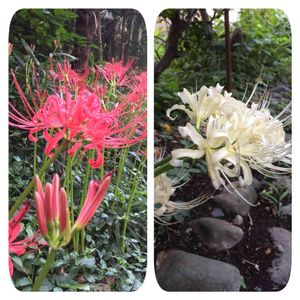 赤と白の彼岸花が咲きました。 白の彼岸花は、シロハナマンジュシャゲと言って、赤と、黄色の雑種だそうです。