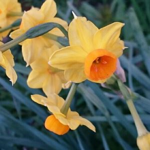 ラッパスイセン ヒガンバナ科 白のスイセンは清楚で可憐な雰囲気やけど、 黄色とオレンジののラッパスイセンは 愛嬌があってオチャメなカンジがする😊💓 青みがかった緑の細い葉っぱが、よく似合ってる✨