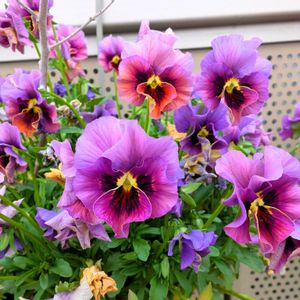 【ビオラのハンギング】 沢山咲いてきました❣️ 『ときめきスミレ プレミアム』💜 『君待ち』🤎 『ときめきビオラ オレンジボム』💛 『ときめきビオラ シナモンフィグ』🩷
