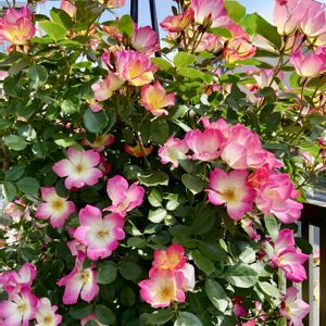 自作のスタンダード仕立てのつるバラピンクカクテルが満開?です。 今咲かせるつもりはなかったのですが摘蕾が間に合わず…でもこんなに咲きたがってるならもういいかなと。 夏顔でも沢山咲いてるとかわいいですよね☺️ みどりのまとめもあるのでよろしければご覧ください。