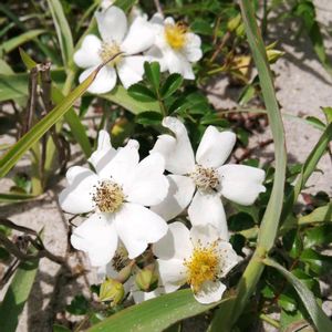 No.1594 テリハノイバラ 和名:照葉野茨 別名:ハイバラ 漢名:光葉薔薇 バラ科バラ属 その1 和名は、葉の表面に光沢があることから🌹 ノイバラの花の大きさは2センチくらいですが、テリハノイバラはその倍くらいの大型の花です🌹 雄しべは多数です🌹 花柱は柱状に合着し、毛があります🌹 海岸の砂場に這いつくばって生えてます🌹 海へ出る砂ふかき道花いばら 大井雅人