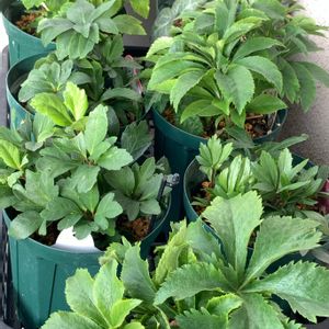 クリスマスローズたち7鉢✨ 古葉は倒れてから取るらしい無いけど😆 つぼみは干からびてました🍁💦 下から2段目2鉢がニゲル🤍🤍 液肥+置き肥しました♡︎(°´ ˘ `°)/ 草は無いけどスミレ生えてきた( ˙³˙)~♡