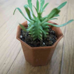 ①外した笹ガニ(ユーフォルビア) 残った一つです… ②③④⑤6個入ってた株から2個抜きまして4個残ってます はい、一つ星にしました…💦 外管理は、傷みやすいな… 親株の方は、塊?群生?で、比較的しっとりしてる感じ…