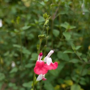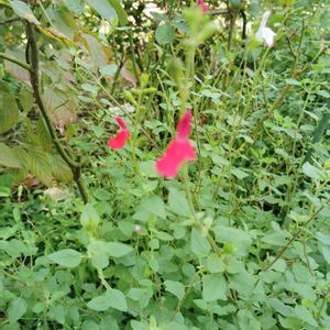 チェリーセージ ホットリップス 紅白色のチェリーさんなんですが、今朝は真ピンクの花が咲いていました🌸 夕方こんな色に…♡ 暑すぎて焼けちゃったかな。