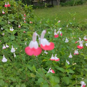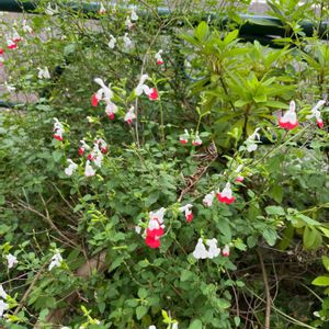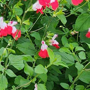 チェリーセージ・ホットリップス❤️ (シソ科) メキメキ アメリカ南部原産 気温の変化によって毎日花色が変化するみたい。夏は赤系 気温が下がると白が増える不思議な花。この先赤くなっていくのかなぁ〜😆 葉っぱは甘いフルーツの様な香りがする様です♪ タカナシ乳業バラ園にて撮影📷