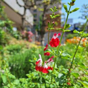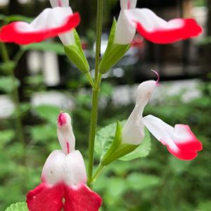 🍀チェリーセージ・ホットリップス🍀 今日、午前中は凄い雨風で🌧️🌪️☔🌧️☔🌪️ お庭は酷い状態です。😭😭😭😂😅💦💦 明日は支柱を立てたり折れた花達を何とかしなければ〜 雑貨も2つ壊れました〜😭😭😭 ホットリップスは少し前に写していました。 最初は赤一色ですが、気温が上がってくると 可愛いリップになってきます。