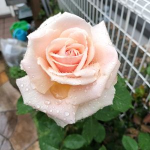 出張から戻りました、雨ですね 大きな薔薇ではこの子1本きりなうちの庭 3年目かな それでも2花に絞って開花させました