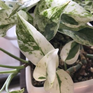 ポトスエクセレントが届きました。 時々行く園芸店で瀕死の状態から店員さんが復活させたというエクセレントを見て惹かれてしまい、帰宅後気づいたらポチッとしておりました。 白い部分はマーブルクイーンの方が象牙のような温かみのある白で、エクセレントは白磁のような澄んだ白。 模様の入り方はエンジョイ似。 葉の形はエンジョイよりさらに一回り小さくしゅっとしていて、色と相まってとても上品。 エンジョイほどではないけれどわずかな造花チックなくしゃくしゃ感があります。 2次元で見るより実物はもっともっと綺麗です。 近づいたらいい香りがしそうな気品を漂わせていらっしゃいます。 とっても気に入ってしまいました。 育てるの難しそうなので慎重に行こうと思います。