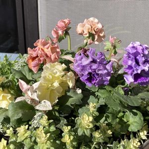 【パンジー&ビオラ】 松原園芸 『スリールドランジュ』の寄せ植え ⑤枚目が11月初旬のお迎え当初 一輪ずつお色の混ざりが違くてどのような感じに育つのかなと思っていました。 『ガーデンシクラメン』を寄せ植えているので軒下で育てています。 あまり日が当たらないところですがここまでお花が増えました❣️ ①枚目は日が当たらない方から写真撮りました🤳 シェードガーデン向きかも😍 一緒に寄せ植えしている 『横浜セレクションフレアブルー』 『ももか ふじいろ』(名前書いてなかったのですが…多分??) 素敵色です🩵💙