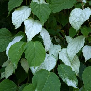 マタタビ 猫に与えると興奮しすぎるのでご注意⚠ 一本の枝に緑と白い葉が混ざって目を引きますね 老爺柿にに似た実を付けますがコレはムシコブの様な形をしています