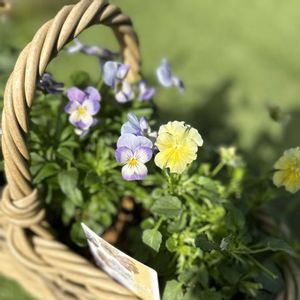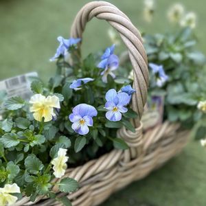 北島園芸さんのビオラ『コルティルーチェ 』 フリフリ光り輝いてます 色抜けしても絶対可愛いはず.*・゚ 雰囲気の違う2苗を寄せ植えにしました🧺 株が拡がるまで小物で埋めるスタイル🤭