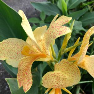 おはようございます😃 今日もどんより曇りで蒸し暑いです☁️ カンナ3種類が咲き揃いました🙌😊 ⬅️カノーバイエロー🌼 レモン色に近いです🍋 🌿真ん中🌺カノーバローズ 最初に開花したからか伸び悩んでいて😅赤に近いです❤️ ➡️カノーバブロンズスカーレット 赤よりのオレンジ色です🧡 日照不足で花の色が悪いような気がします😓 それに、葉っぱを食べてるのは誰ですかー😩🐛 食べていいのは、ホテイソウだけよっ‼️