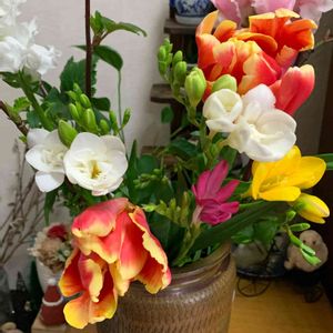 連投すみません💦🙏 春のお花を飾りました 暖かくて、一気に開いてしまいそうな勢いです 春はやっぱりチューリップ🌷ですか フリージアの香りもいいし ストックも可愛いですね 一緒にセットされてた長い枝は なんのお花が咲くのか 楽しみです お部屋がパッと明るくなりました♬︎♡