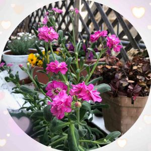 おはようございます😄 寄せ植えの中のストックです。 元気でいっぱい花をつけています❣️