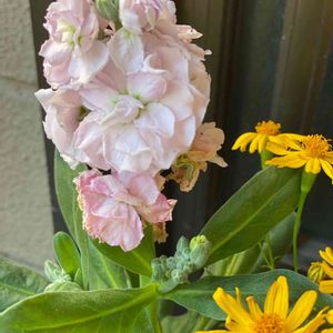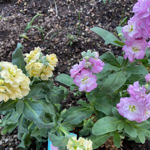 ストック🌸 ピンクと、イエロー、地植えしました😃 切り花でばかりで、購入していましたが、植えてあると、菊みたいに切り花✂️にも出来るのかなー?と思って👍 来年、咲くといいな😊💓 来年、咲くといいな👍
