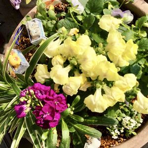 我が家の今日の花 金魚草の寄せ植え(๑・̑◡・̑๑) ストックの花もすみれもアリッサムも入れました🤗 優しい黄色い金魚草を見つけ嬉しくて購入💖💖🧡💛💛💛(*^o^*) ◎ 良く咲くすみれ(薄紫色) 🏷チーム.ブルー 冬に向けての寄せ植えしました❤️❤️❤️ *・゜゚・*:.。..。.:*・'(*゚▽゚*)'・*:.。. .。.:*・゜゚・*