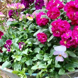 🌿マイガーデン🌿より 冬の寄せ植えたち ストック八重ピンク 濃淡 ムラサキ シロ ストック一重 薄きいろ 宿根ネメシア 2種 パンジー&ビオラ 花かんざし などなど 大きな木鉢 夏の寄せ植えから模様替え👚 から3週間 ストック八重さんは 花首をカットして植えたら 脇芽がどんどん咲いて ボリューム満点に 😊