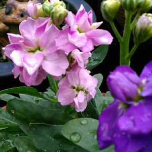 ストックの花 脇から花芽を出し寒い☔の中気丈に咲いています 🌸🌸🌸