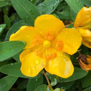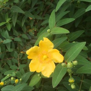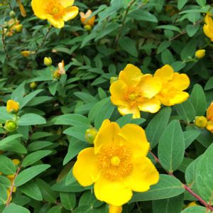 こんばんは😃🌃 「大輪キンシバイ(ヒペリカム・ヒドコート)」 善通寺境内にある華蔵院の庭園で綺麗に咲いていました。 撮影日 2020.5.27 以下、メモです。 混乱しやすいオトギリソウ属の花について簡単にまとめてみました。 オトギリソウ属の植物は学名を片仮名表記した「ヒペリカム」の名称で扱われることが多い。 ヒペリカムの主な品種には、 1. キンシバイ、2. ビョウヤナギ、3. H. ヒドコート、4. H. カリシヌム、5. H. トリカラー、6. H. アンドロサエナム、7. H. キャンディフレアー等がある。 キンシバイ(金糸梅、Hypericum patulum)は下垂性で、雄しべは花弁より短く、花弁はあまり大きく開かない。一方、園芸品種であるヒペリカム・ヒドコート(大輪キンシバイ)では、大輪の名にふさわしく花弁が大きく全開する。また、ヒペリカム・カリシヌム(西洋キンシバイ)やビヨウヤナギはオシベが長い。