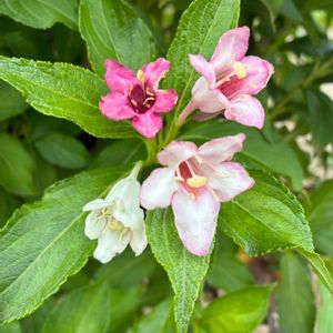 我が家の箱根ウツギ。咲き始めは白、少したつとピンクに、そしてエンジへと色が変わっていくんですって。いろんな色が混ざって咲いていて可愛いです😊