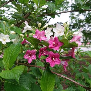 春には咲かなかった ハコネウツギが今頃 ポツリポツリ咲いてます♫ 今朝、気付きました🤍🩷