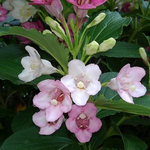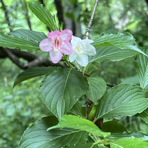 ハコネウツギ。 白と赤の2色の花が咲くのがハコネウツギだと思っていたのですが、咲き始めは白で、だんだんに紅色になるようです。その経過で淡いピンク色にもなるのですね。 別名、ベニウツギ、ゲンペイウツギとも呼ばれるそうです。
