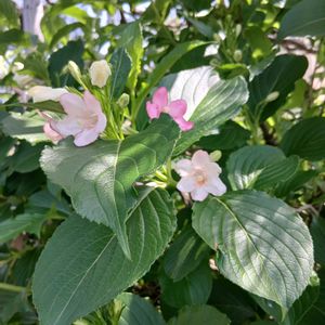 今日のお庭 1️⃣ セッコク ラン科 真っ白い蕾が やっと 開花し始めました 純白 爽やか〜🎶 2️⃣ハコネウツギ スイカズラ科 白花から濃いピンクに色変わり とっても可愛いので 花友さんからの 挿木で 大きくなりました🤗 庭に彩り🎶 3️⃣ニゲラ (クロタネソウ) キンポウゲ科 零れ種から毎年沢山の🌱 今年はどの色が多いかな? 細い茎の先に 不思議花姿 風にユラユラ🎶 花後姿も また不思議😅 4️⃣ゼニアオイ アオイ科 この花も 毎年 あちこちに🌱 可愛い花🌸 白花の花姿は まだ先の様子 5️⃣チェリーセージ ハーブ シソ科 紅花と白花 フルーティな 甘い香りが 可愛い花姿と 共に キュンキュン 癒し🩷🤗