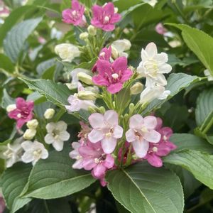 (スイカズラ科 タニウツギ属) ①~③🌸タニウツギ🌸 ④🌸ハコネウツギ🌸 ⑤🌸斑入りオオベニウツギ🌸 タニウツギは少し早かったようで…全体のは蕾ばかり🤣 タニウツギ すぐに名前が分からず 間違ってたら教えてください🙏 ハコネウツギ④白とピンクの花があったのに消してしまったようで😅何とかあるかな 家の近くです✌️ 斑入りオオベニウツギ 立派なお花でした🌸 ここは コメント💬閉まれ〰ゴマ🙏😊