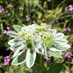 ハツユキソウに… 実がつき始めてました〜〜🟢🟢 今年は零れ種からの発芽がたくさんあったので、種まきせずにたくさん咲いてくれて嬉しい・:*:・(*´ー`*人)♡ ピンクのバーベナ・バンプトンが ハツユキソウの白×グリーンを 引き立ててくれてる💚🤍💕