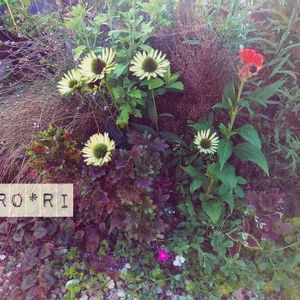 大人色の宿根草たちの中に こぼれダネからのオルレアや ヒルザキツキミソウが顔を出す庭の一角。 いい雰囲気になりました。
